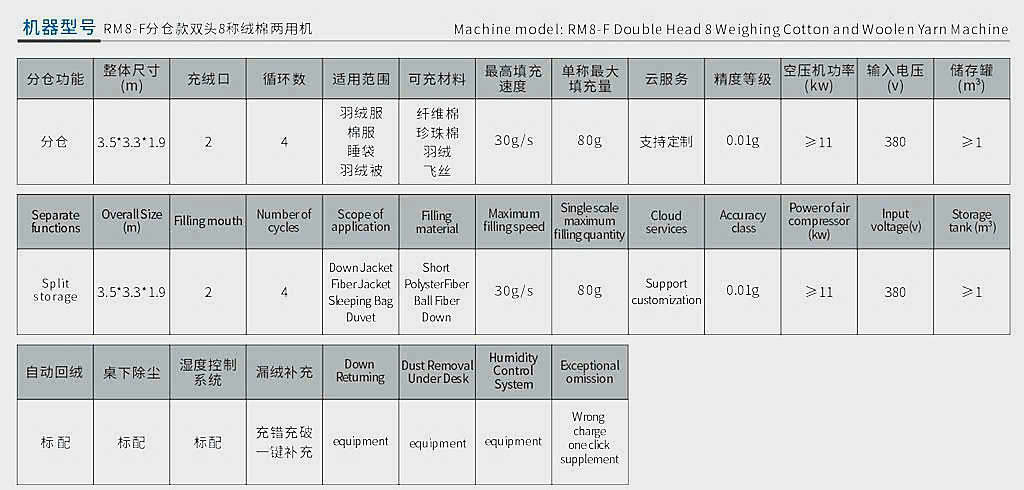 Máy nhồi bông, lông vũ tự động HY-RM8-F là dòng máy nhồi cả bông và lông chia khoang hoạt động hoàn toàn tự động và độc lập cho từng loại lông, bông. Máy sử dụng hệ thông cân chân không không chạm, Máy có 2 cửa ra lông, bông và mỗi cửa ra lông, bông có 4 cân chân không được sử dụng tuần hoàn tự động.